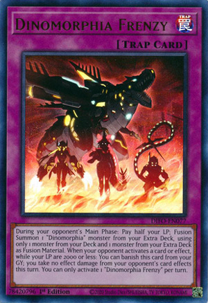 During your opponent’s Main Phase: Pay half your LP; Fusion Summon 1 “Dinomorphia” monster from your Extra Deck, using only 1 monster from your Deck and 1 monster from your Extra Deck as Fusion Material. When your opponent activates a card or effect, while your LP are 2000 or less: You can banish this card from your GY; you take no effect damage from your opponent’s card effects this turn. You can only activate 1 “Dinomorphia Frenzy” per turn.