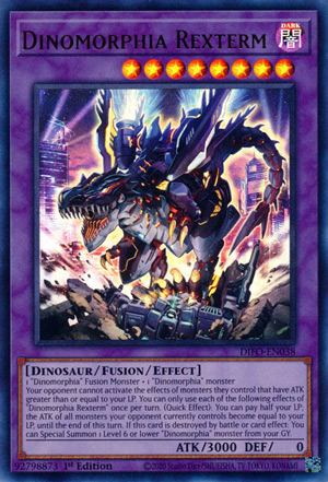 Rexterm is a Level 8 DARK Dinosaur Fusion with 3000 ATK and 0 DEF. Good ATK, DARK is great, and Dinosaur has good support. Fusion Materials are any Dinomorphia Fusion and any other Dinomorphia monster, so thankfully Frenzy exists to make this feasible. First effect prevents the opponent from activating the effects of monsters they control with ATK greater than or equal to your LP, which is great considering how low on LP you get easily in Dinomorphia, likely shutting down a majority of the opponent’s monsters. The remaining effects are a hard once per turn, first being a Quick Effect to pay half your LP and change the ATK of all monsters the opponent controls to the total of your LP, which now lets you make your opponent’s LP some unorthodox numbers when you battle them and helps ensure the opponent isn’t getting over this since their monsters are most likely going to have 1000 or less LP after this effect resolves in most cases. Second effect triggers upon destruction, letting you revive a Level 6 or lower Dinomorphia monster, so you can at least get the other Fusions back. I do like Rexterm, as it helps Dinomorphia find an actual win condition and something you’d want to get on the field as soon as possible with as low of LP as possible. Frenzy also makes this card playable as well, cause it’d be rough if we had to still rely on Domain to summon this thing.