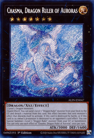 (Quick Effect): You can send 1 Level 7 “Dragon Ruler” monster from your Deck to the GY and detach 1 material from this card; this effect becomes that sent monster’s effect that discards itself to activate. If this card is destroyed by battle, or if this card in its owner’s possession is destroyed by an opponent’s card effect: You can Special Summon 1 Level 7 “Dragon Ruler” monster from your GY or banishment. You can only use each effect of “Chasma, Dragon Ruler of Auroras” once per turn.
