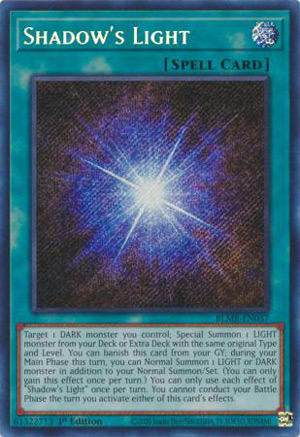 Target 1 DARK monster you control; Special Summon 1 LIGHT monster from your Deck or Extra Deck with the same original Type and Level. You can banish this card from your GY; during your Main Phase this turn, you can Normal Summon 1 LIGHT or DARK monster in addition to your Normal Summon/Set. (You can only gain this effect once per turn.) You can only use each effect of “Shadow’s Light” once per turn. You cannot conduct your Battle Phase the turn you activate either of this card’s effects.