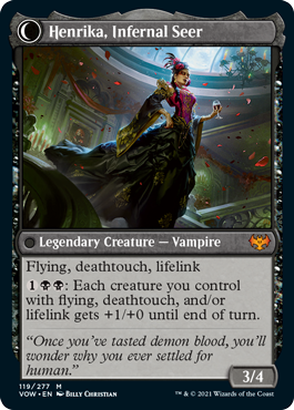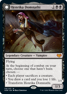 Henrika Domnathi is interesting: incremental advantage that turns into a flying threat, or just a flying threat then and there. Her triggering at the start of combat means you can get immediate value (by either forcing sacrifice or getting another card), and she’s pretty nifty once she does flip. A 3/4 with evasion, lifelink, deathtouch, and the ability to pump a team can really push a game into a much faster tempo, and while lacking haste means she’s not likely to want to flip immediately, it’s a nice looming threat. 3 toughness is slightly awkward before she flips, but it’s not terrible (especially if you can take a creature out with her, though note that everyone sacrifices), and she’s a workhorse card who can help support her tribe in a long game. Mono-black means that she’s at home in all strains of Vampire deck, and that’s not so bad for as solid as she is as a value piece.