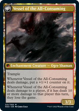 Three mana to potentially take out an entire board of tokens or other small value pieces is already quite a nice deal, and that’s before we get to the rest of the card. When you consider just how many things that first half hits, you can definitely wreck an opponent rather nicely for three mana, and that’s before Hidetsugu Consumes All flips two turns later and consumes graveyards along the way. Vessel of the All-Consuming can pose quite a threat since it grows in response to it doing any damage, and while that “loses the game” rider is mostly more flavorful than threatening, it might prove its value in the right scenario.