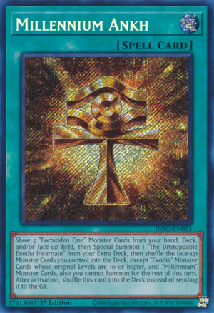 Millennium Ankh first is a Normal Spell that makes you show the opponent 5 Forbidden One monsters from the hand, Deck, and/or face-up field to summon The Unstoppable Exodia Incarnate from the Extra Deck, then you must shuffle face-up Monster Cards into the Deck that are not Millennium monsters or Exodia monsters whose original Level is 10 or higher. So you get your boss monster, but you can’t keep any monster on the field unrelated to the archetype. It at least shuffles Forbidden One monsters into the Deck, where they’re likely safer from ending up in the graveyard vs remaining on your field. You also can’t summon for the rest of the turn after activation, which makes up for the lack of any HOPT preventing you from getting 3 giant Exodias out in a turn. It also shuffles itself back into the Deck after resolving, so you can hopefully research it out or draw it again to use your Millennium effects without paying so many LP. This is the heart and soul of the Exodia/Millennium Deck. You reveal it so you don’t drain your LP so fast and it gets you to your boss monster. Play 3 and hope to see it instantly. Maybe multiples so you can activate one and keep another to reveal.