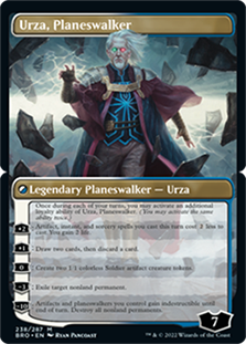 I’ve often pondered the curiosity of modern planeswalkers going from (for example) being a knight of Bant’s round table to slaying gods on Theros to hanging out in jazz clubs in New Capenna. But a character like Urza actually had many different roles during his life, too, and this card is intended to represent him right at the beginning of his long planeswalk. I’d be surprised if he was supposed to be literally this powerful even before he learned everything he did later on, but much like Mishra’s meld card, the idea seems to be that if you meet the high level of requirements, you basically win the game. The crazy thing about him is that he can do that either on his own or in combination with your other cards. The cost reduction and card drawing make for very explosive plays, the soldier tokens and exile ability can stabilize many kinds of situations; and as for his ultimate, if you needed a second Golgothian Sylex representation in the set, you have one.